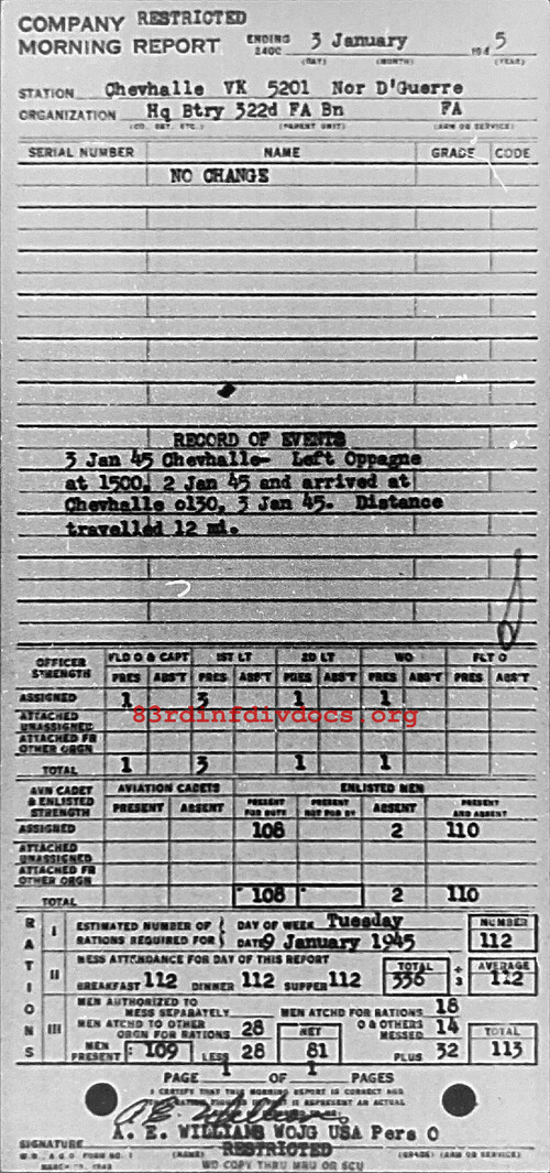 Morning report HQBTRY/322FA for January 3, 1945