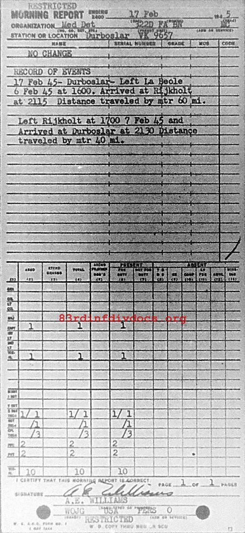 Left La Beole 6 Feb 45 at 1600. Arrived at Rijkholt at 2115. Distance traveled by motor 60 miles. Left Rijkholt at 1700, 7 Feb 45, arrived at Durboslar at 2130. Distance traveled by motor 40 miles.