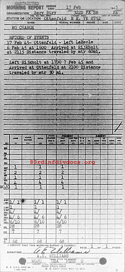 Left La Beole 6 Feb 45 at 1600. Arrived at Rijkholt at 2115. Distance traveled by motor 60 miles. Left Rijkholt at 1700, 7 Feb 45, arrived at Ottenfeld at 2100. Distance traveled by motor 30 miles.