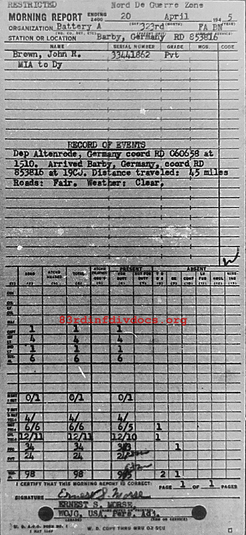 Dep Altenrode, Germany, coord rD060568 at 1510. Arrived Barby, Germany, coord rD853816 at 1900. Distance traveled: 45 miles. Roads: Fair. Weather: Clear.
