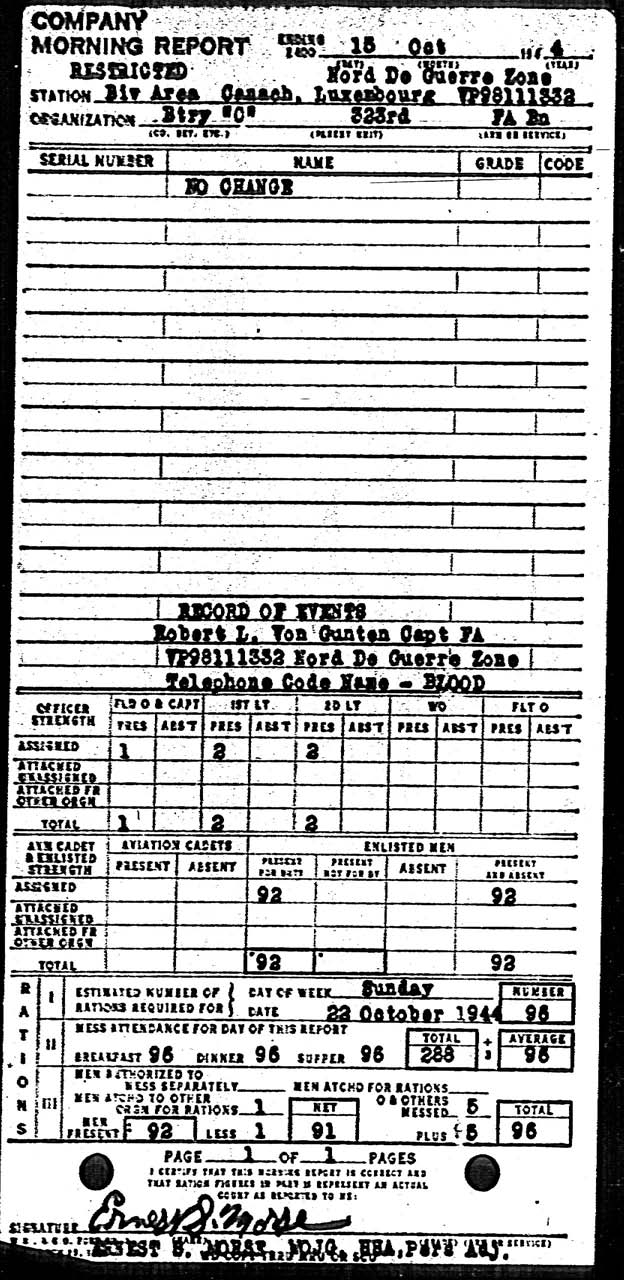 Robert L Von Gunten, Capt FA, vP98111332 Nord de Guerre Zone. Telephone Code Name - Blood