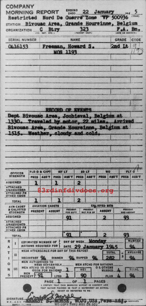 Dept Biv Area, Joubieval, Belgium at 1330. Traveled by motor, 22 miles. Arrived Biv Area Grande Hoursinne, Belgium at 1515. Weather, cloudy and cold.