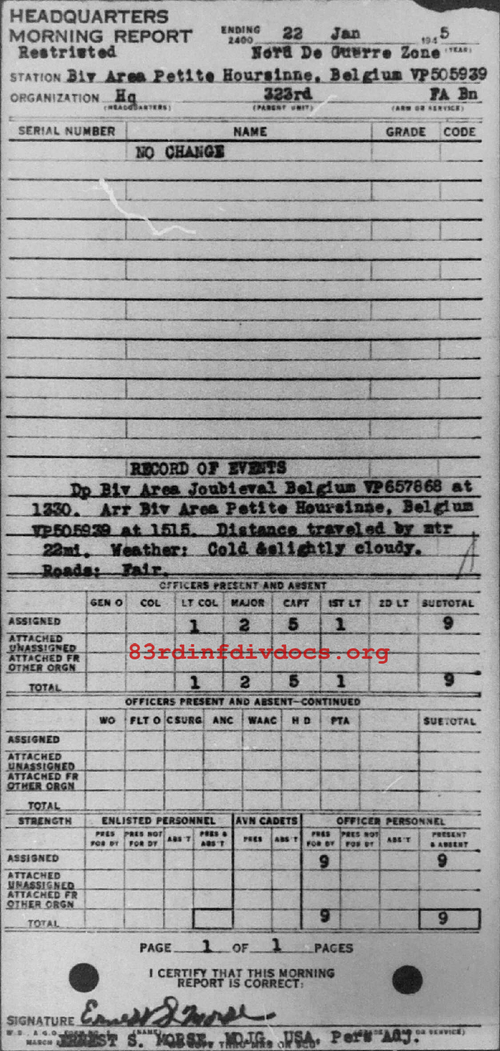 Dp Biv Area Joubieval, Belgium vP657868 at 1330. Arr Biv Area Petite Hoursinne, Belgium vP505939 at 1515. Distance traveled by mtr 22 mi. Weather: Cold and slightly cloudy. Roads: Fair.