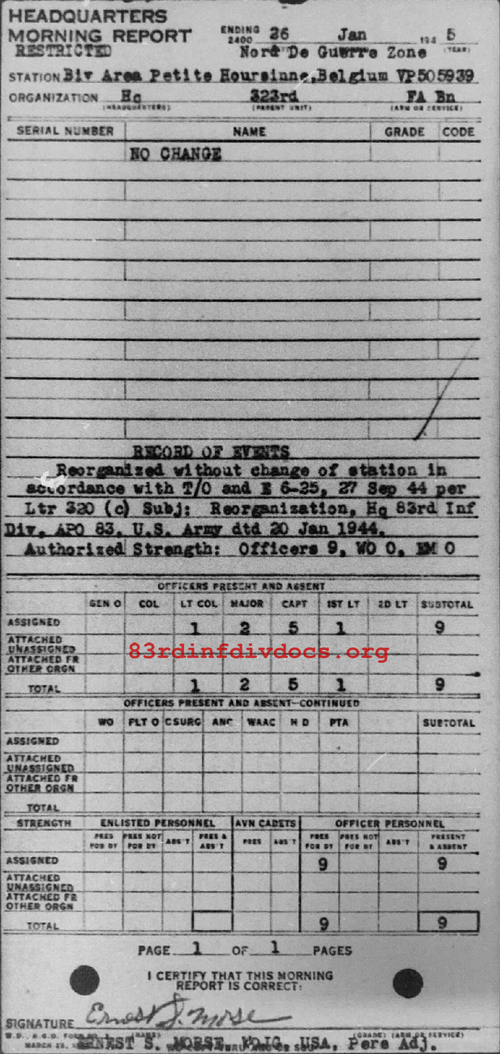 Reorganized without change of station in accordance with T/O and E6-25, 27 Sep 44 per ltr 320 (c) Sub: Reorganization, Hq 83rd Inf Div, APO 83, U.S. Army dtd 20 Jan 1944. Auth Strength: Officers 9, WO - 0, EM - 0