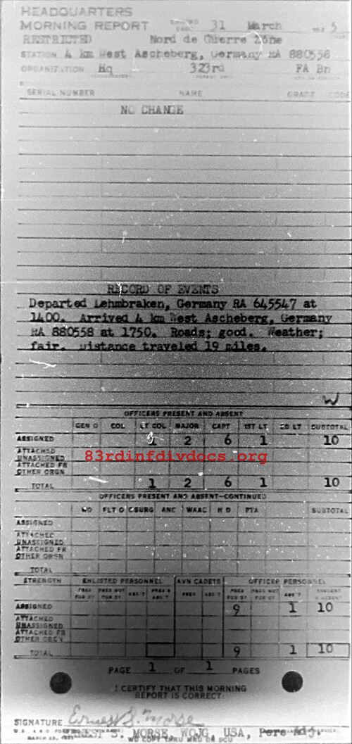 Departed Lehmbraken, Germany rA645547 at 1400. Arrived 4 km West Ascheberg, Germany rA880558 at 1750. Roads: Good. Weather: Fair. Distance traveled 19 miles.