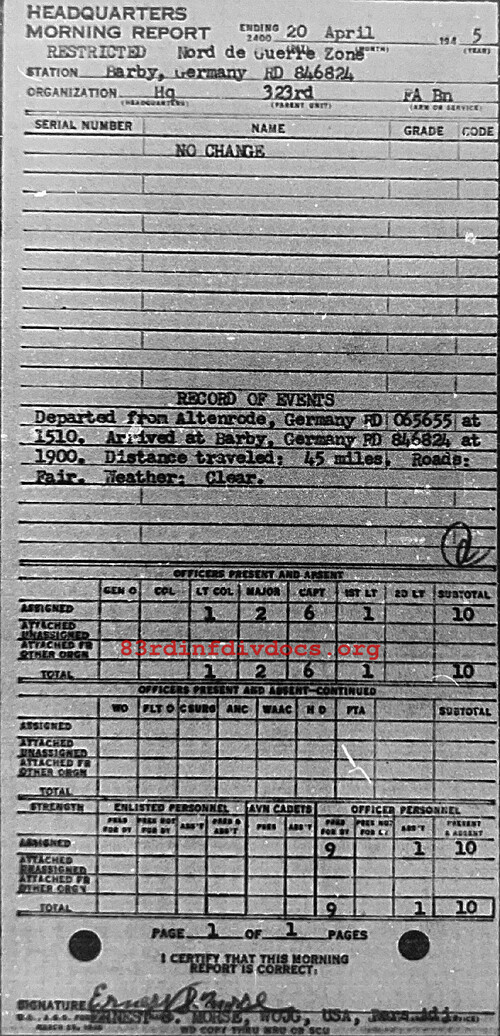 Morning report HQ/323FA for April 20, 1945