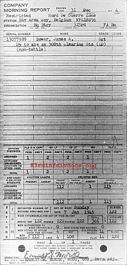 Morning report HQBTRY/323FA for December 31, 1944