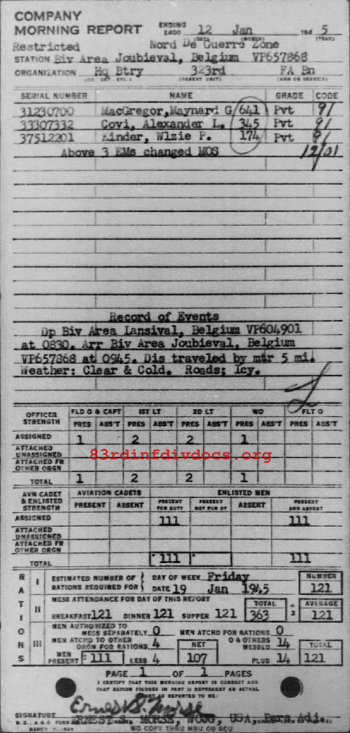 Morning report HQBTRY/323FA for January 12, 1945