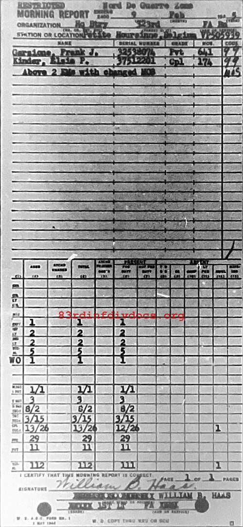 Morning report HQBTRY/323FA for February 9, 1945