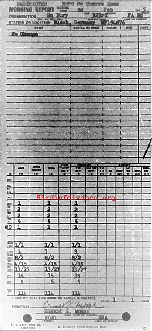 Morning report HQBTRY/323FA for February 28, 1945