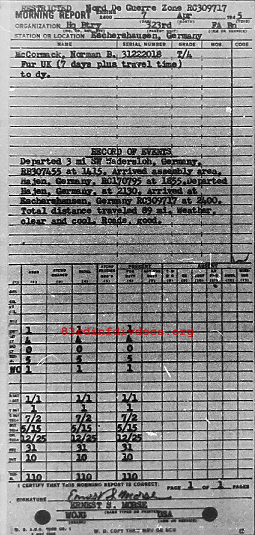 Morning report HQBTRY/323FA for April 7, 1945