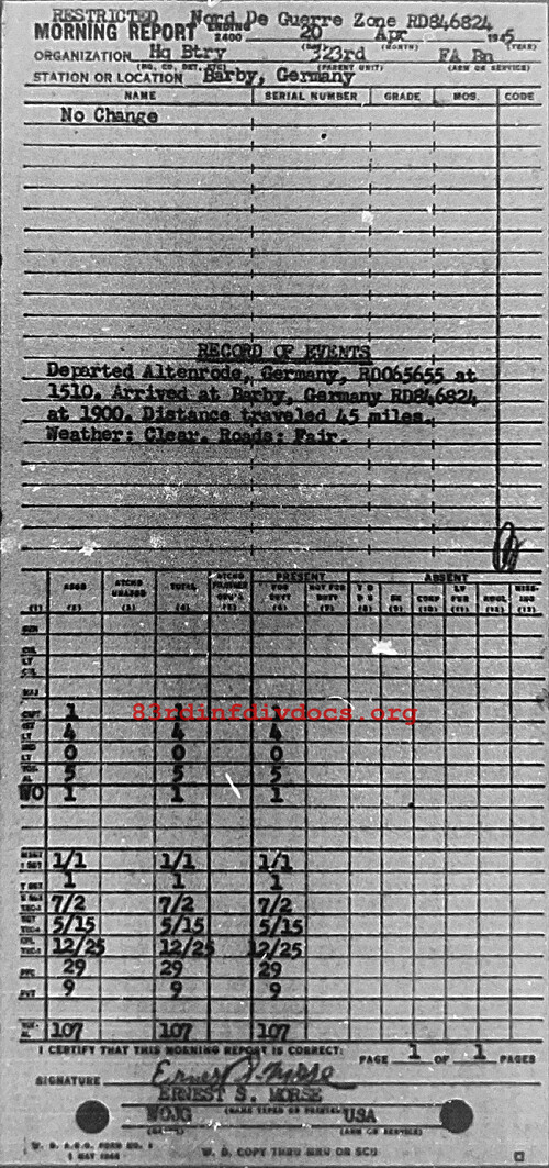 Morning report HQBTRY/323FA for April 20, 1945