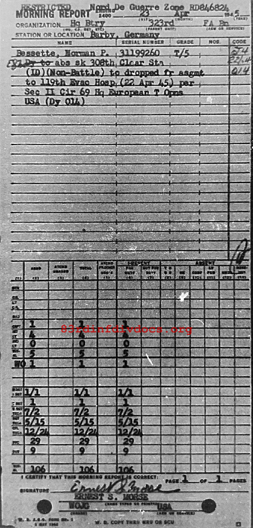 Morning report HQBTRY/323FA for April 23, 1945