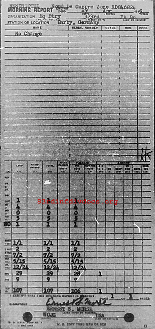 Morning report HQBTRY/323FA for April 29, 1945