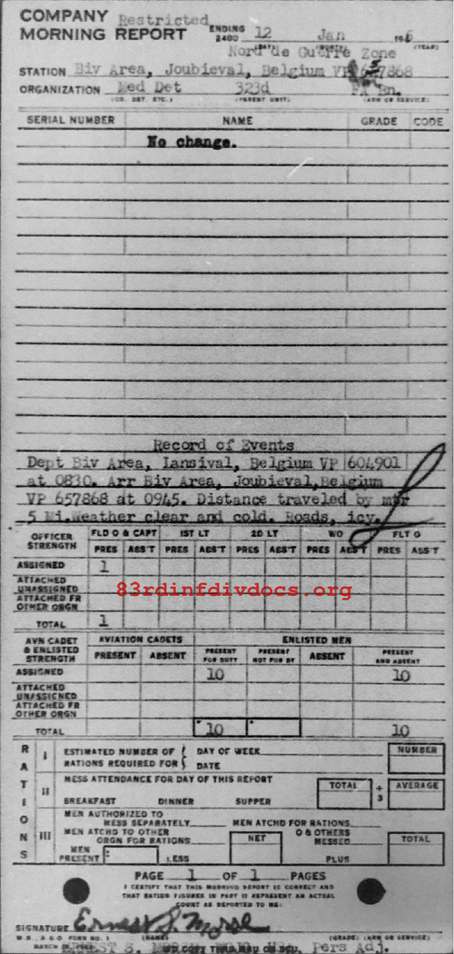Dept Biv Area, Lansival Belgium vP604901 at 0830. Arr Biv Area, Joubieval, Belgium vP657868 at 0945. Distance traveled by mtr 5 Mi. Weather clear and cold. Roads, icy.