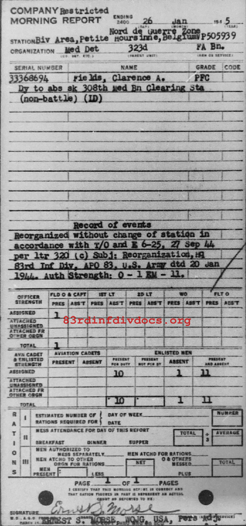 Reorganized without change of station in accordance with T/O and E6-25, 27 Sep 44 per ltr 320 (c) Sub: Reorganization, Hq 83rd Inf Div, APO 83, U.S. Army dtd 20 Jan 1944. Auth Strength: O - 1, EM - 11