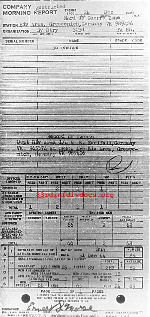 Dept Biv Area 1/4 mi E. Zweifall, Germany, vK965374 at 0830. Arr Biv Area, Gressenich, Germany, vK989426.