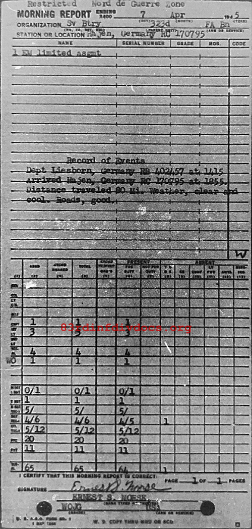 Dept Liesborn, Germany, rB402457 at 1415. Arrived Hajen, Germany, rC170795 at 1855. Distance traveled 80 Mi. Weather: Clear and cool. Roads: Good.