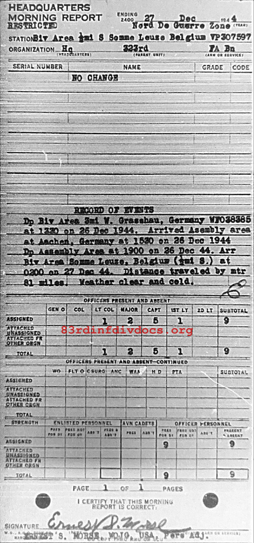 Dp Biv Area, 3 mi W Grasshau, Germany, coord wF038385 at 1330, on 26 Dec 44. Arrived Assembly Area at Aachen, Germany at 1530 on 26 Dec 44. Dp Assembly Area at 1900 on 26 Dec 44. Arr Biv Area Somme Leuze, Belgium (1/2 mi S.) at 0200 at 27 Dec 44. Distance traveled by motor: 81 miles. Weather: Clear and cold.