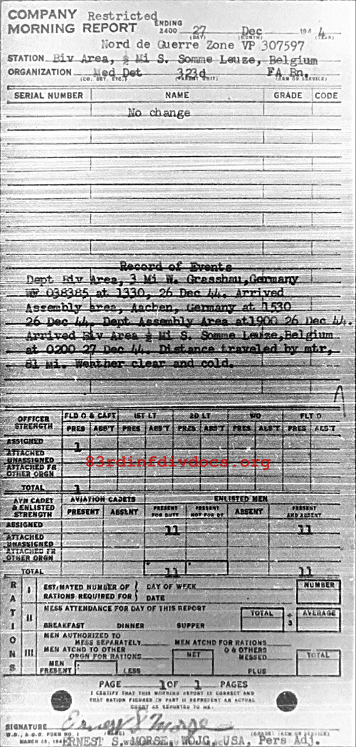 Dept Biv Area, 3 mi W Grasshau, Germany, wF038385 at 1330, 26 Dec 44. Arrived Assembly area Aachen, Germany at 1530, 26 Dec 44. Dept Assembly Area at 1900, 26 Dec 44. Arrived Biv Area Somme Leuze, Belgium at 0200, 27 Dec 44. Distance traveled by motor: 81 miles. Weather: Clear and cold.