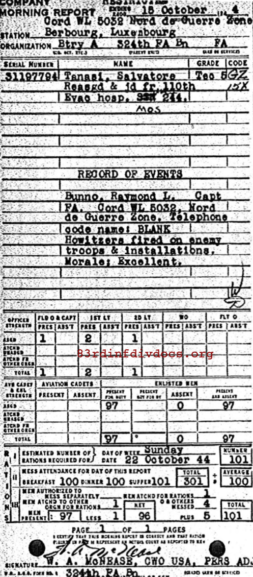 Bunno, Raymond L Capt FA. Coord WL5032 NdG. Telephone code name: BLANK. Howitzers fired on enemy troops and installatiopns. Morale: Excellent.