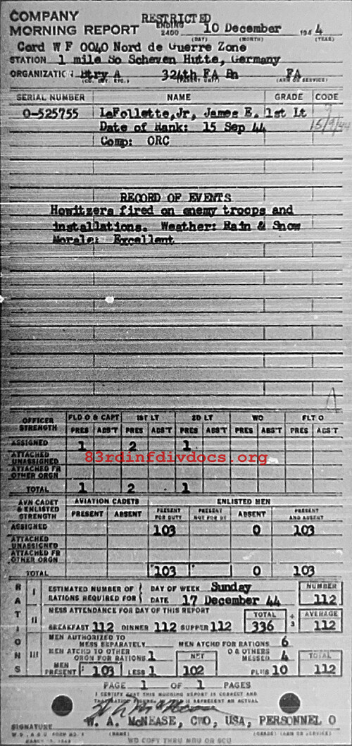 Howitzers fired on enemy troops and installations. Weather: Rain & Snow. Morale: Excellent.