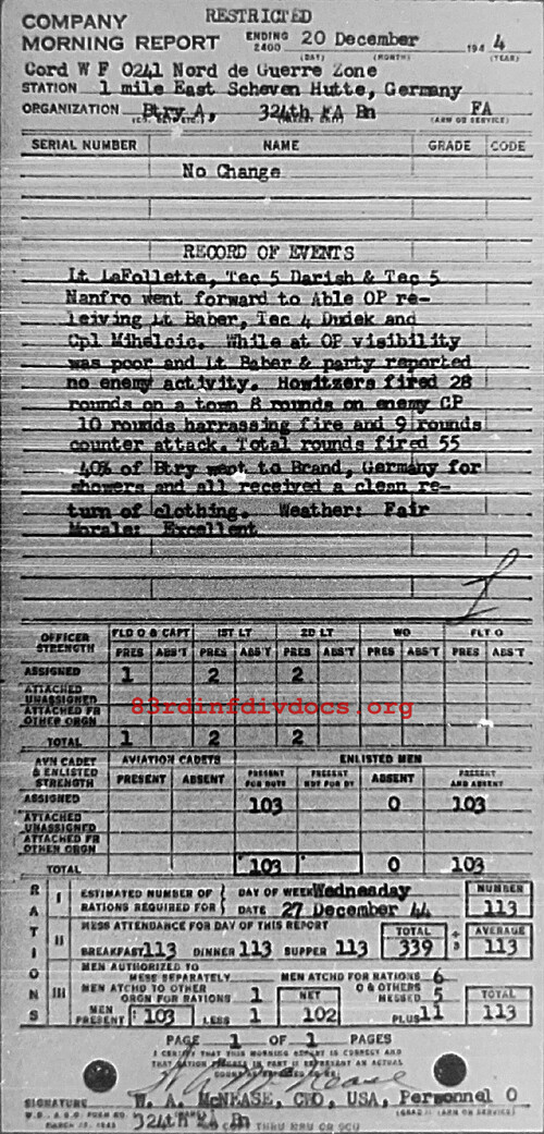 Lt LaFollette, Tec5 Darish & Tec 5 Nanfro went forward to Able OP releiving Lt Baber, Tec 4 Dudek and Cpl Mihelcic. While at OP visibility was poor and Lt Baber & party reported no enemy activity. Howitzers fired 28 rounds on a town, 8 rounds on enemy CP, 10 rounds harassing fire and 9 rounds counter attack. Total rounds fired 55. 40% of Btry went to Brand, Germany for showers and all received a clean return of clothing. Weather: Fair. Morale: Excellent.
