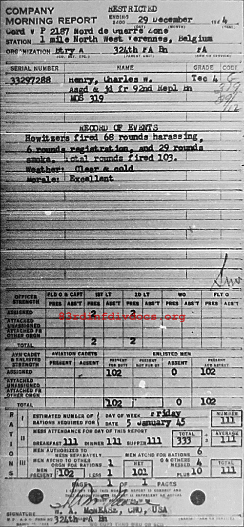 Howitzers fired 68 rounds harassing, 6 rounds registration, and 29 rounds smoke. Total rounds fired 103. Weather: Clear & cold. Morale: Excellent.