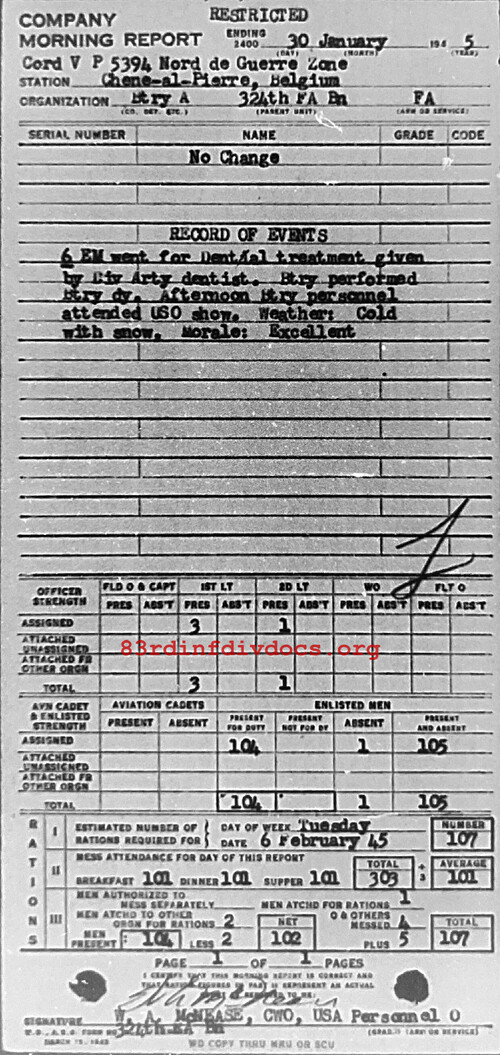 6 EM went for Dental treatment given by Div Arty dentist. Btry performed Btry dy. Afternoon Btry personnel attended USO show. Weather: Cold with snow. Morale: Excellent.