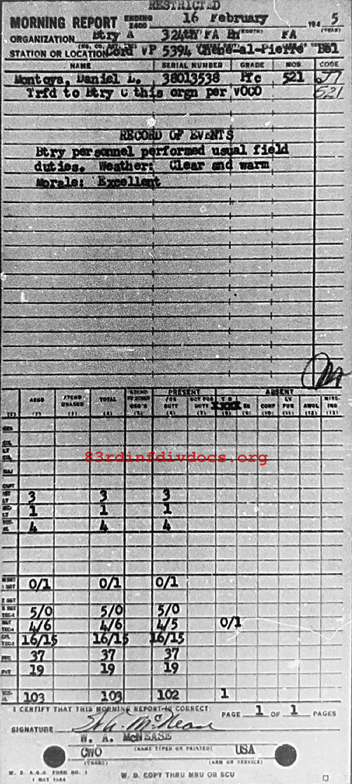 Btry personnel performed usual field duties. Weather: Clear and warm. Morale: Excellent.