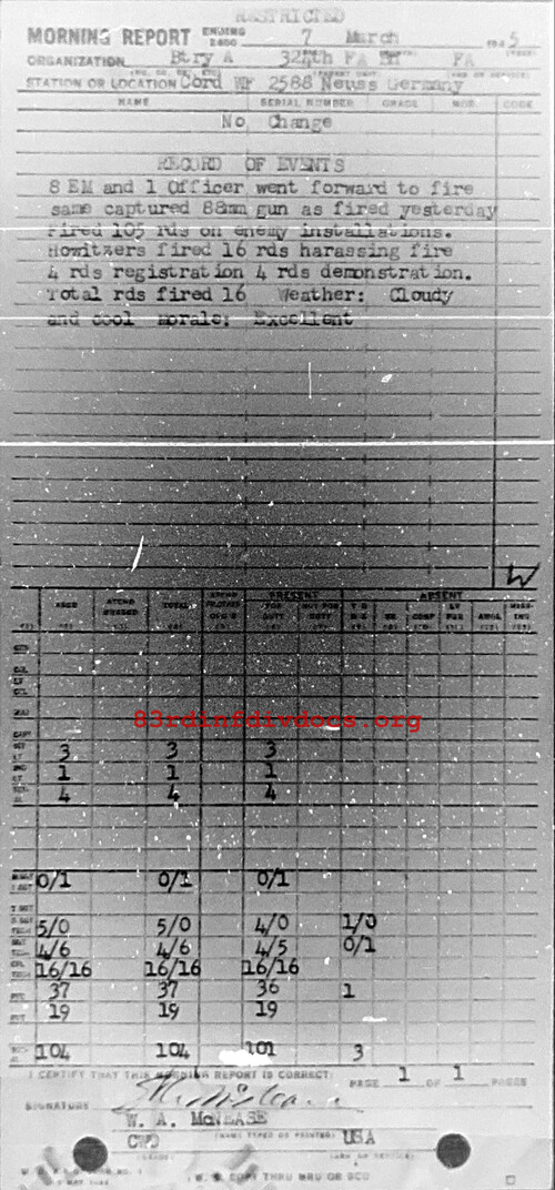 8 EM and 1 Officer went forward to fire same captured 88mm gun as fired yesterday. Fired 105 rds on enemy installations. Howitzers fired 16 rds harassing fire, 4 rds registration, 4 rds demonstration. Total rds fired 16. Weather: Cloudy and cool. Morale: Excellent.