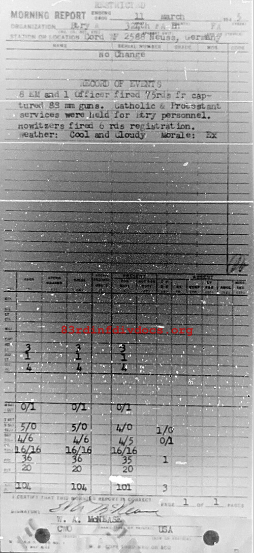 8 EM and 1 Officer fired 75 rds fr captured 88m guns. Catholic & Protestant services were held for Btry personnel. Howitzers fired 6 rds registration. Weather: Cool and cloudy. Morale: Excellent.