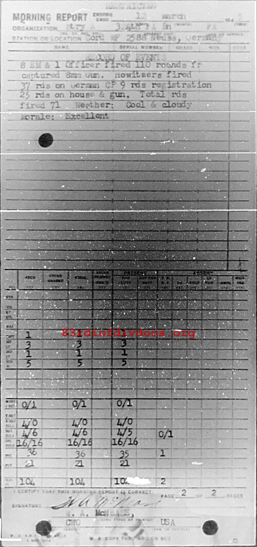 8 EM & 1 Officer fired 110 rounds fr captured 88mm Gun. Howitzers fired 37 rds on German CP, 9 rds registration, 25 rds on house & gun. Total rds fired 71. Weather: Cool and Cloudy. Morale: Excellent.