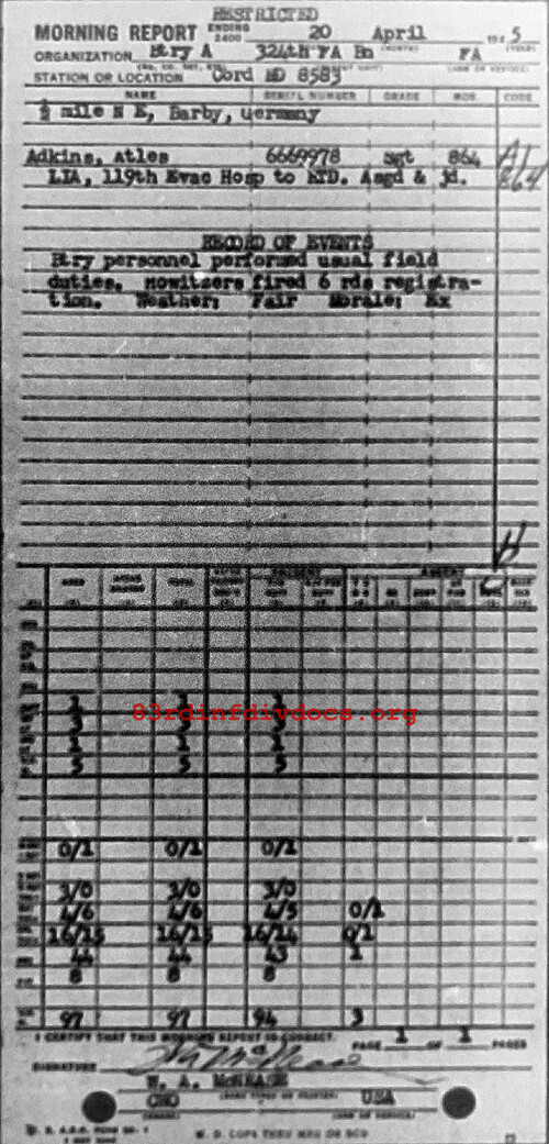 Btry personnel performed usual field duties. Howitzers fired 6 rds registration. Weather: Fair. Morale: Excellent.