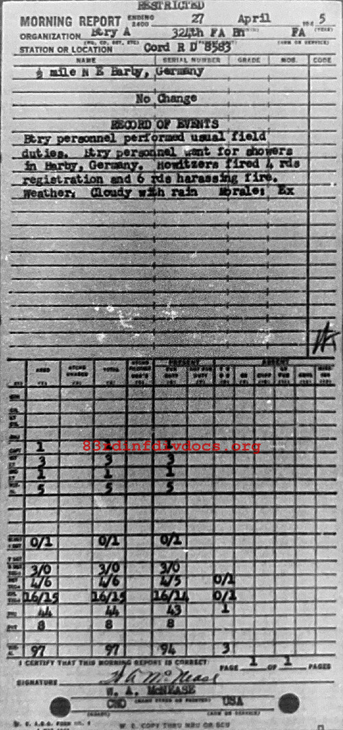 Btry personnel performed usual field duties. Btry personnel went for showers in Barby, Germany. Howitzers fired 4 rds registration and 6 rds harassing fire. Weather: Cloudy with rain. Morale: Excellent.