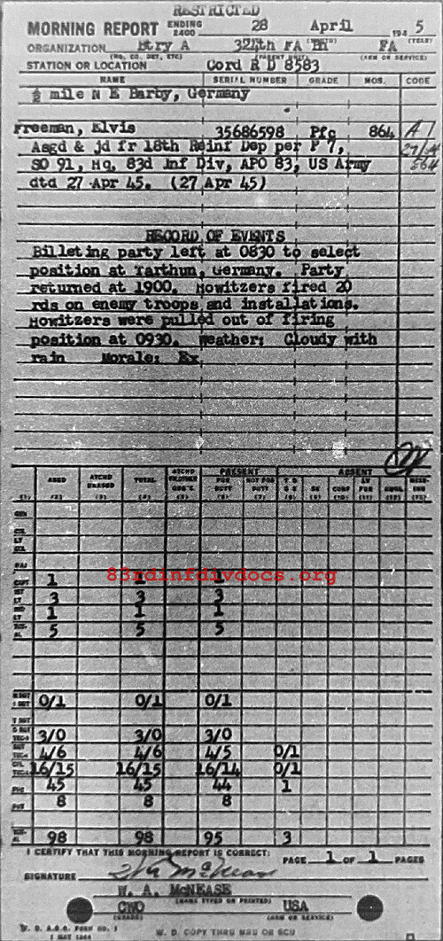 Billeting party left at 0830 to select position at Tarthun, Germany. Party returned at 1900. Howitzers fired 20 rds on enemy troops and installations. Howitzers were pulled out of firing position at 0930. Weather: Cloudy with rain. Morale: Excellent.