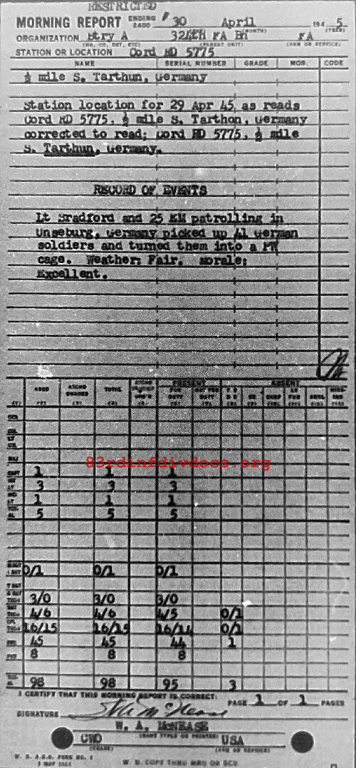 Lt Bradford and 25 EM patrolling in Unseburg, Germany picked up 41 German soldiers and turned them into a PW cage. Weather: Fair. Morale: Excellent.