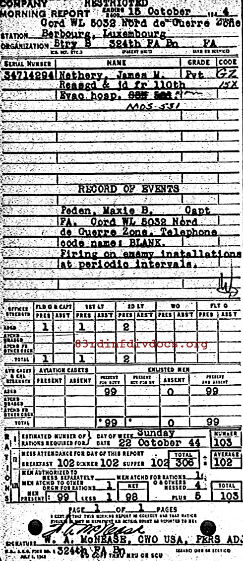 Morning report B/324FA for October 15, 1944