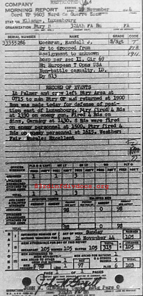 Lt Palmer and crew left Btry area at 0715 to man Btry OP and returned at 1900. Rcn was made today for defense of position east of Luxembourg. Btry fired 4 Rds at 1330 on enemy gun. Fired 4 rds Sinz, Germany at 1430. 8 Rds were fired on enemy personnel at 1500. Btry fired 4 Rds on enemy personnel at 1615. Weather: Fair. Morale: Excellent.