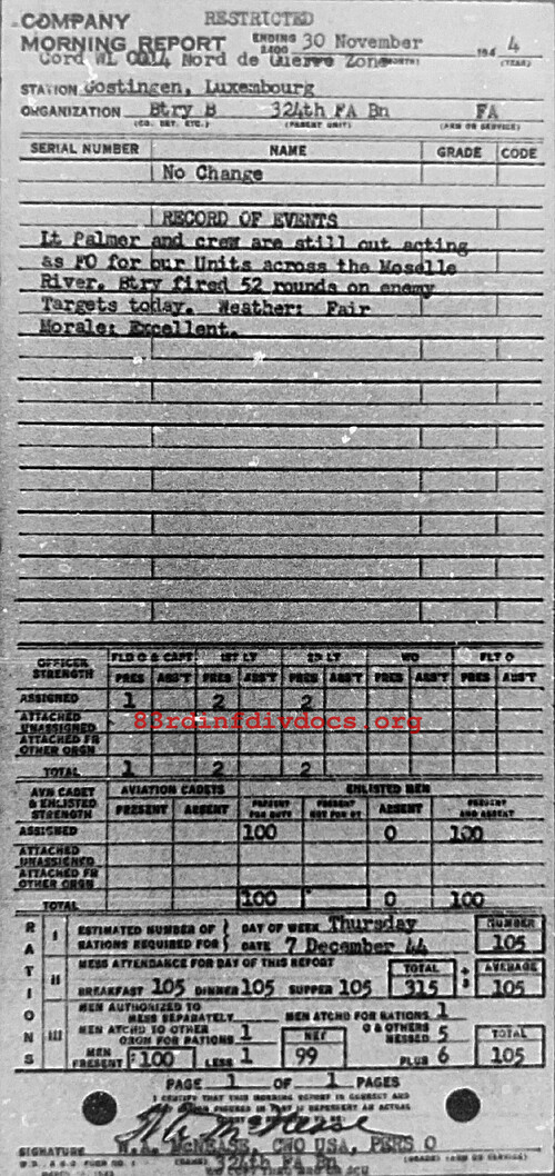 Lt Palmer and crew are still out acting as FO for our Units across the Moselle River. Btry fired 52 rounds on enemy targets today. Weather: Fair. Morale: Excellent.
