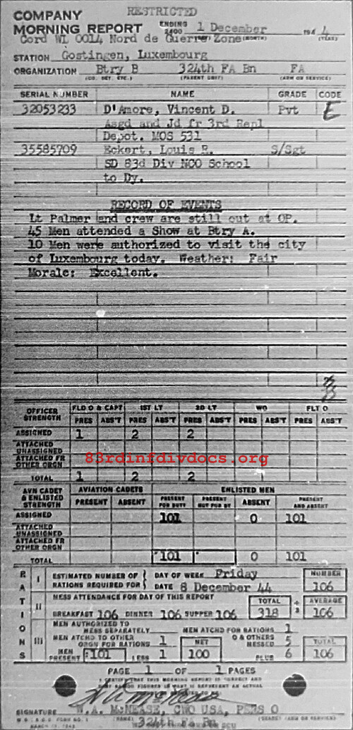 Lt Palmer and crew are still out at OP. 45 Men attended a Show at Btry A. 10 Men were authorized to visit the city of Luxembourg today. Weather: Fair. Morale: Excellent.