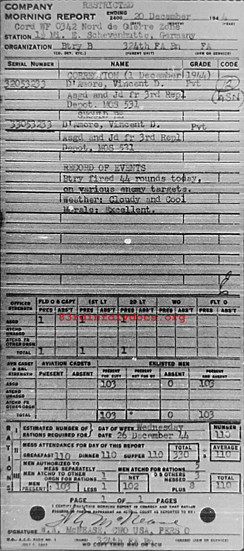 Btry fired 44 rounds today, on various enemy targets. Weather: Cloudy and Cool. Morale: Excellent.