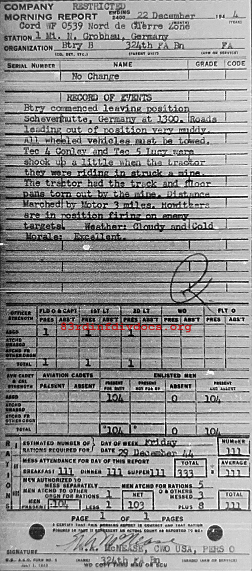 Btry commenced leaving position Schevenhutte, Germany at 1300. Roads leading out of position very muddy. All wheeled vehicles must be towed. Tec 4 Conley and Tec 5 Lucy were shook up a little when the tractor they were riding in struck a mine. The tractor had the track and floor pans torn out by the mine. Distance Marched by Motor 3 miles. Howitzers are in position firing on enemy targets. Weather: Cloudy and cold. Morale: Excellent.