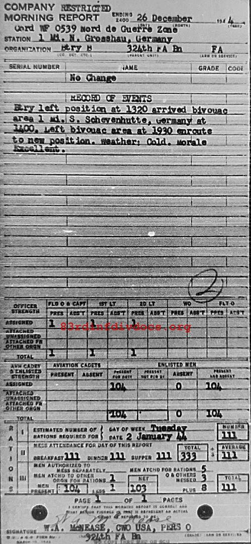 Btry left position at 1320 arrived bivouac area 1 Mi. S. Schevenhutte, Germany at 1400. Left bivouac area at 1930 enroute to new position. Weather: Cold. Morale: Excellent.