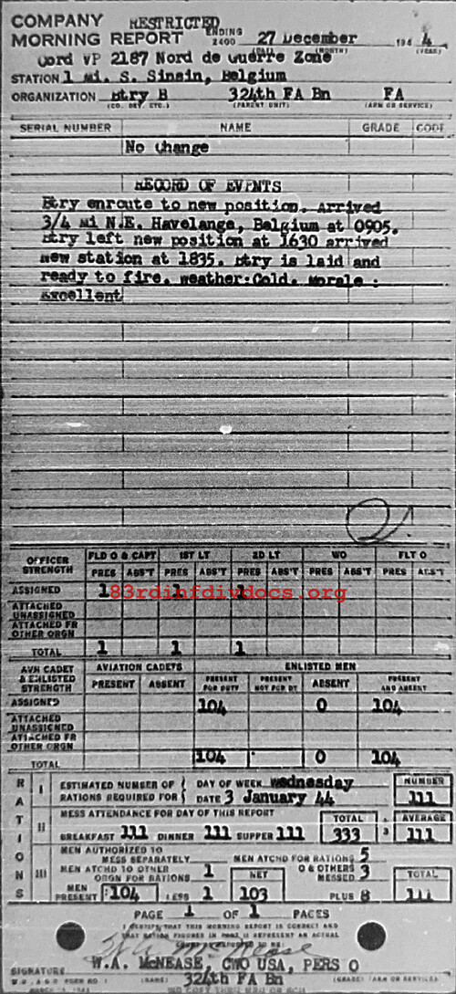 Btry enroute to new position. Arrived 3/4 Mi N.E. Havelange, Belgium at 0905. Btry left new position at 1630 arrived New station at 1835. Btry is laid and ready to fire. Weather: Cold. Morale: Excellent.