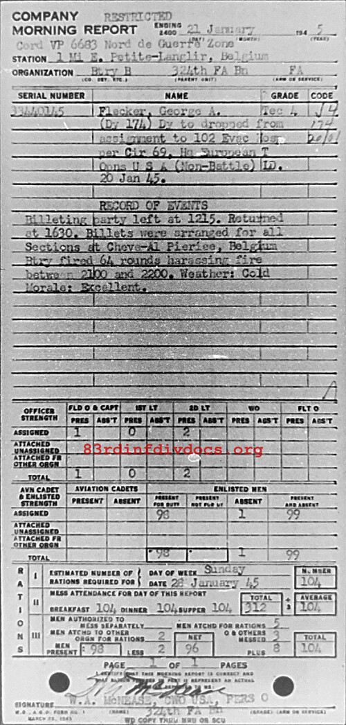 Billeting party left at 1215. Returned at 1630. Billets were arranged for all Sections at Cheve-Al-Pieriee, Belgium. Btry fired 64 rounds harassing fire between 2100 and 2200. Weather: Cold. Morale: Excellent.