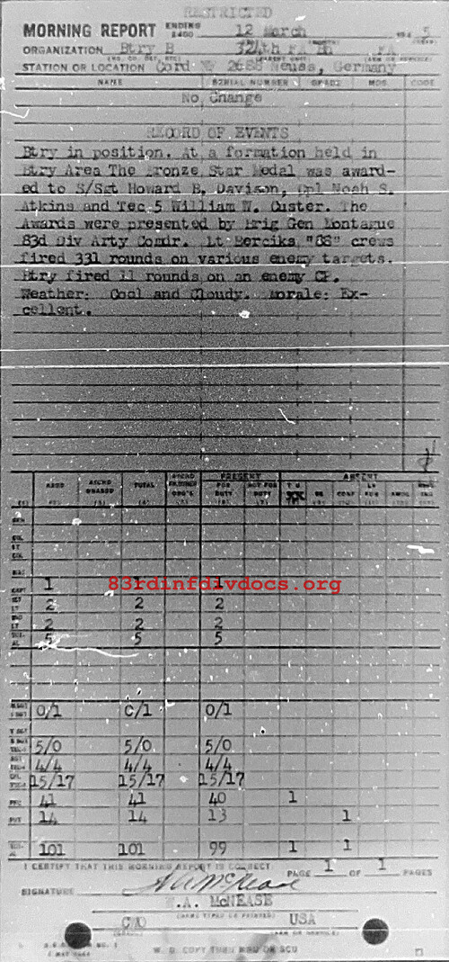 Btry in position. At a formation held in Btry Area, the Bronze Star Medal was awarded to S/Sgt Howard B. Davidson, Cpl Noah S. Atkins and Tec 5 William W. Custer. The awards were presented by Brig Gen Montague, 83rd Div Arty Comdr. Lt Berciks "88" crews fired 331 rounds on various enemy targets. Btry fired 11 rounds on an enemy CP. Weather: Cool and cloudy. Morale: Excellent.