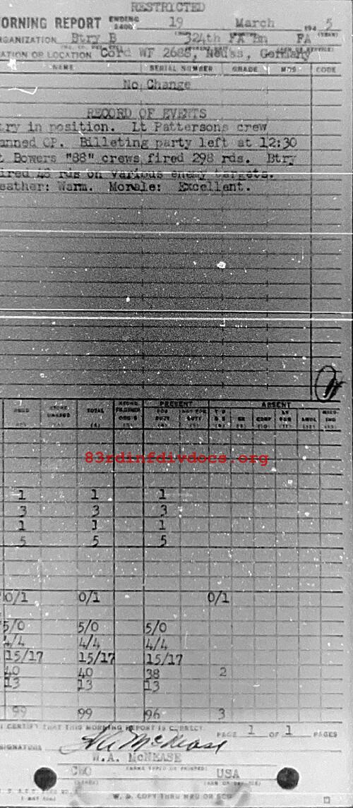 Btry in position. Lt Pattersons crew manned OP. Billeting party left at 12:30. Lt Bowers "88" crews fired 298 rds. Btry fired 48 rds on various enemy targets. Weather: Warm. Morale: Excellent.