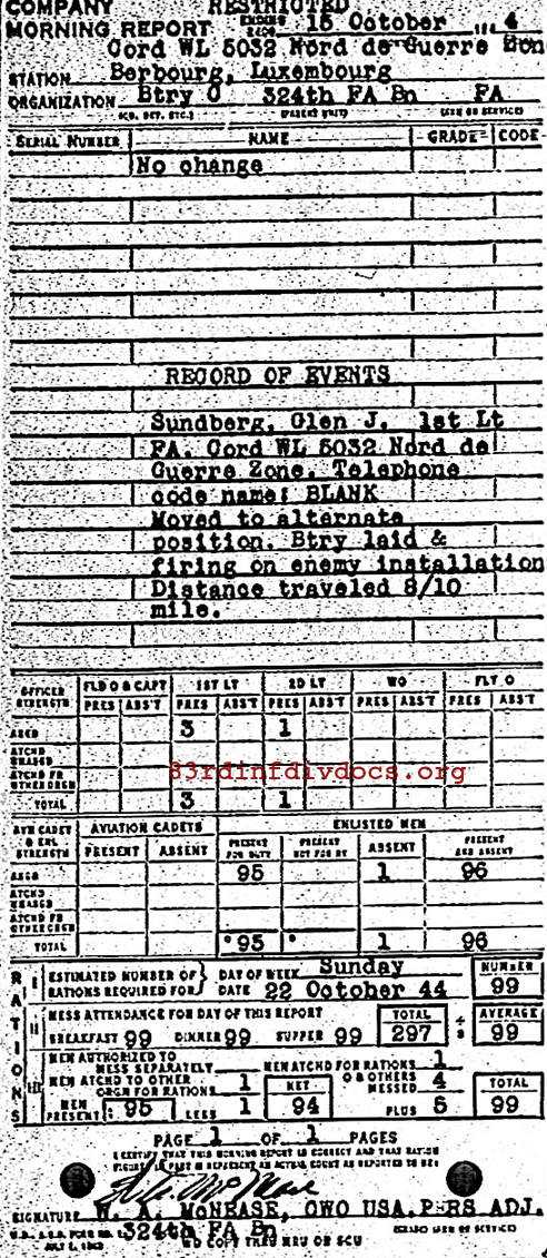 Sundberg, Glen J, 1st Lt FA. Cord WL5032 NdG zone. Telephone code name Blank. Moved to alternate position. Btry laid and firing on enemy installations. Distance traveled 8/10 miles.