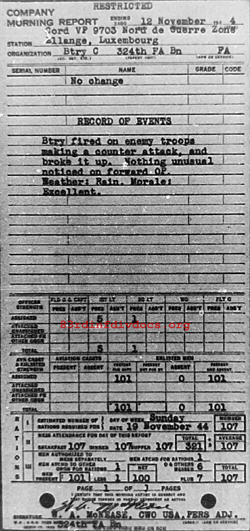 Btry fired on enemy troops making a counter attack, and broke it up. Nothing unusual noticed on forward OP. Weather: Rain. Morale: Excellent.